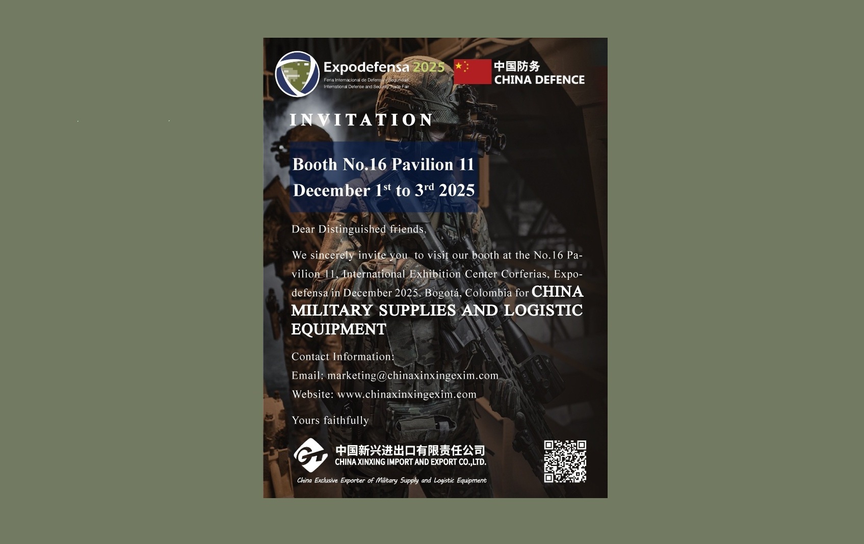 中国新兴进出口有限责任公司(原中国新兴公司)于1984年经国务院、中央军委批准成立,隶属于原中国人民解放军总后勤部,拥有54家下属企业,是当时全军唯一一家公开从事经营活动的综合性军办贸易公司。司具有国务院、中央军委授予的军需品和后勤装备出口专营权,是中国军需后勤装备行业联盟的引领者。在天津、上海、海南、广州、厦门、青岛、深圳等地设有子公司,与全球100多个国家的军警方保持着长期友好合作关系。公司拥有多家生产企业,具有强大的供应链管理能力,主要产品包括军需装备、卫生装备、军交装备、油料装备、野营装备、仓库装备、后勤指挥管理自动化装备、海军专用后勤装备、空军专用后勤装备、导弹部队专用后勤装备及辅助军事装备等。公司可提供国际防务展会服务和综合解决方案,是全球最具规模的军需后勤装备综合服务商。